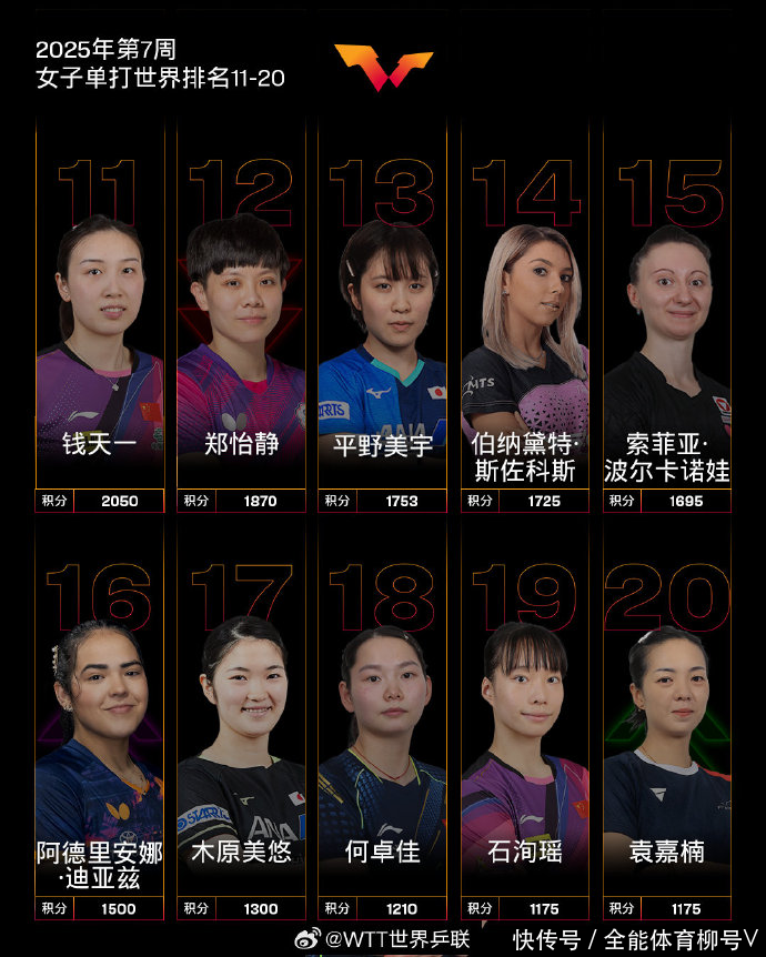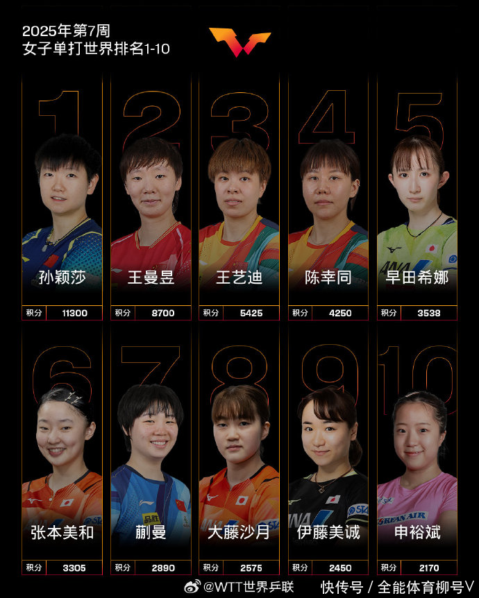 外洋乒联2025年第7周寰球名次,所以2025年WTT新加坡大满贯、2025WTT支线赛多哈站两项赛事为技术节点。夺得新加坡大满贯女子单打冠军的“小魔王”孙颖莎,不息稳坐女单寰球第一宝座。